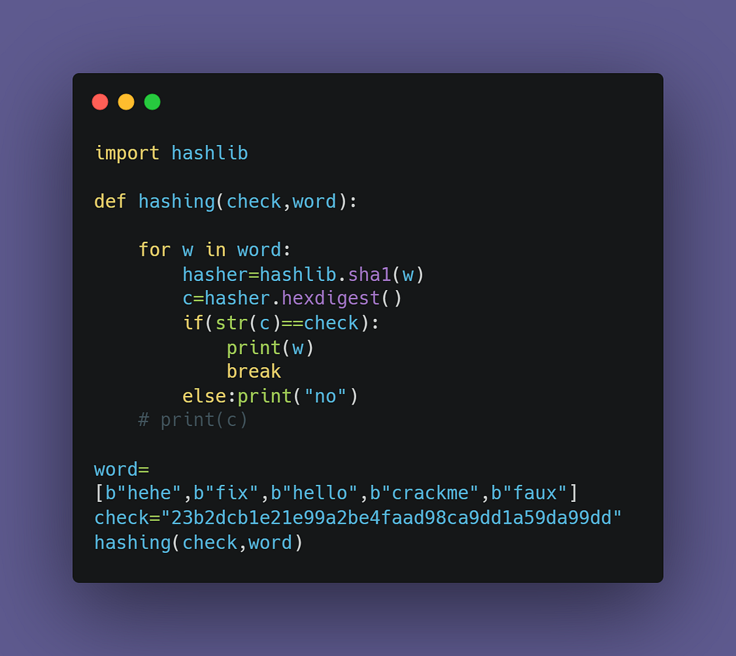 if(str(c)==check):This line checks whether the resulting hash string matches the check parameter. It converts the hash string to a regular string using str() to ensure the comparison is done correctly.